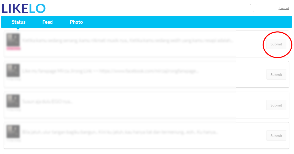 11. Setelah itu anda akan di arahkan ke tampilan baru dan itu adalah tanda-tanda hampir sukses. Dihalaman yang baru tersebut akan anda banyak pilihan seperti status, feet(tautan) dan Foto. Jik anda ingin nmemperbanyak like status maka anda lihat status yang anda perbaharui tadi maka anda tekan submit seperti gambar di bawah ini: